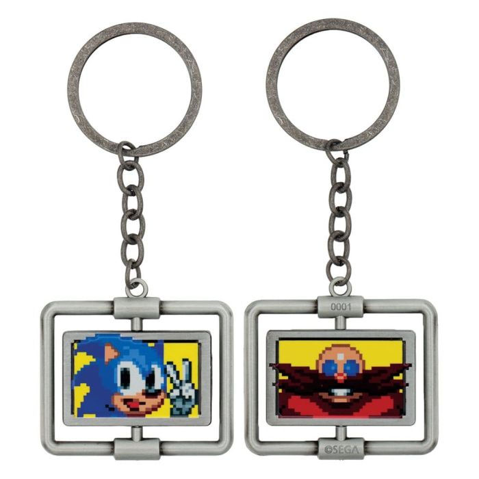 "At the end of each stage in the very first Sonic game, released 35 years ago this year, you pass a sign of Dr. Eggman which flips round to reveal a picture of Sonic as he runs past it. This sign is created here in keyring form, with the central element rotating to show either Sonic or Eggman. Each one is numbered on the reverse and is limited to 9,995 worldwide.