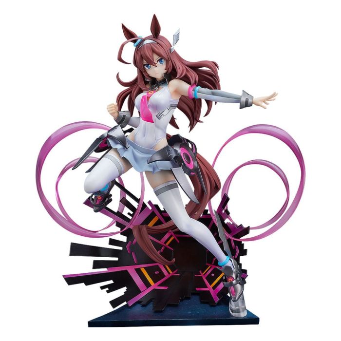 Highly precise gradated paintwork is used in order to faithfully capture the unique textures of her sci-fi-like Signature Racewear. The sleek physique of the "cyborg" Umamusume is modeled with incredible attention to detail, making the figure a joy to view from any angle.